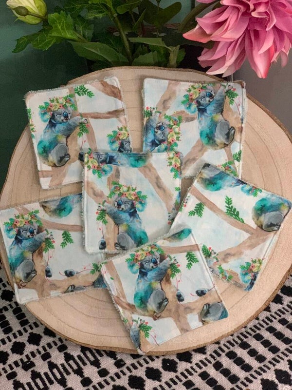 Ces lingettes toutes douces en popeline de coton aux motifs koalas et une face en éponge bambou sont idéales pour pour le change de bébé, le visage des petits mais aussi de plus grands.